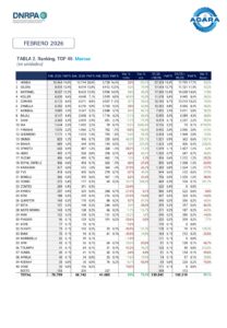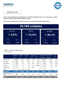 La División Motovehículos de la Asociación de Concesionarios de Automotores de la República Argentina (ACARA) informa que el número de unidades patentadas durante febrero de 2026 fue de 70.799 motovehículos, esto es una suba interanual del 72,3% ya que en febrero de 2025 se habían registrado 41.085 unidades. Si la comparación es contra el pasado mes se observa una suba del 3%, ya que en enero pasado se habían registrado 68.742 unidades.